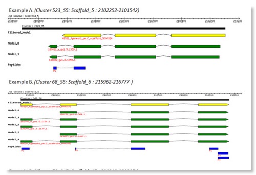 RESULTS: 405 identified peptide sequences were mapped to 214 different A.niger genomic loci to which 4093 predicted gene models clustered, 2872 of which contained the mapped peptides. Interestingly, 13 (6%) of these loci either had no preferred predicted gene model or the genome annotators' chosen "best" model for that genomic locus was not found to be the most parsimonious match to the identified peptides. The peptides identified also boosted confidence in predicted gene structures spanning 54 introns from different gene models.