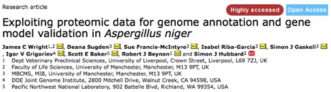 Wright, J.C., Sugden, D., Francis-McIntyre, S., Riba-Gacia, I., Gaskell, S.J., Grigoriev, I V., Baker, S.E., Beynon, R.J. & Hubbard, S.J. (2009)Exploiting proteomic data for genome annotation and gene model validation in Aspergillus niger. BMC Genomics. 10, 61 [PUBMED][PDF]