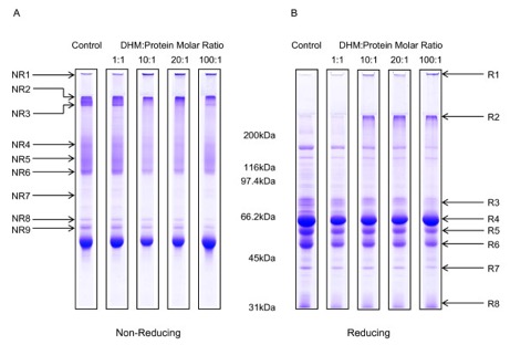 One dimensional gel electrophoresis revealed a significant alteration in the equine plasma protein profile following pyrrole exposure and the formation of a high molecular weight protein aggregate. Using mass spectrometry and confirmation by western blotting the major components of this aggregate were identified as fibrinogen, serum albumin and transferrin.