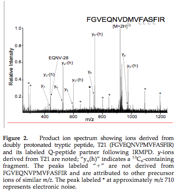 Isolation of tryptic peptide ions, along with their differentially labeled analogs derived from an artificial QconCAT protein, is performed using multiple correlated harmonic excitation fields in an FT-ICR cell. Simultaneous fragmentation of the isolated unlabeled and labeled peptide pairs using IRMPD yields specific y-series fragment ions useful for quantification. The mass increment attributed to stable isotope labeling at the C-terminus is maintained in the C-terminal fragment ions, providing multiple measurements of labeled/unlabeled intensity ratios during highly selective detection. The utility of this approach has been demonstrated in the absolute quantification of components of an unfractionated chicken muscle protein mixture.