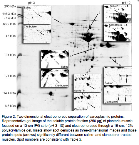 Previous investigations of the effects of clenbuterol have used suprapharmacological doses that induce myocyte death, alter muscle phenotype, and do not approximate the proposed therapeutic dose for humans. Recently, we reported that smaller doses of clenbuterol induce muscle growth without causing myocyte death. In the present study we used histochemical and proteomic techniques to investigate the molecular effects of this dose. Male Wistar rats (n = 6, per group) were infused with saline or 10 microg/kg/day clenbuterol via subcutaneously implanted osmotic pumps. After 14 days the animals' plantaris muscles were isolated for histochemical and proteomic analyses. Clenbuterol induced significant muscle growth with concomitant protein accretion and preferential hypertrophy of fast oxidative glycolytic fibers. Clenbuterol reduced the optical density of mitochondrial staining in fast fibers by 20% and the glycogen content of the muscle by 30%. Differential analysis of two-dimensional gels showed that heat shock protein 72 and beta-enolase increased, whereas aldolase A, phosphogylcerate mutase, and adenylate kinase decreased. Only heat shock protein 72 has previously been investigated in clenbuterol-treated muscles. The clenbuterol-induced increase in muscle growth was concomitant with qualitative changes in the muscle's proteome that need to be considered when proposing therapeutic uses for this agent.